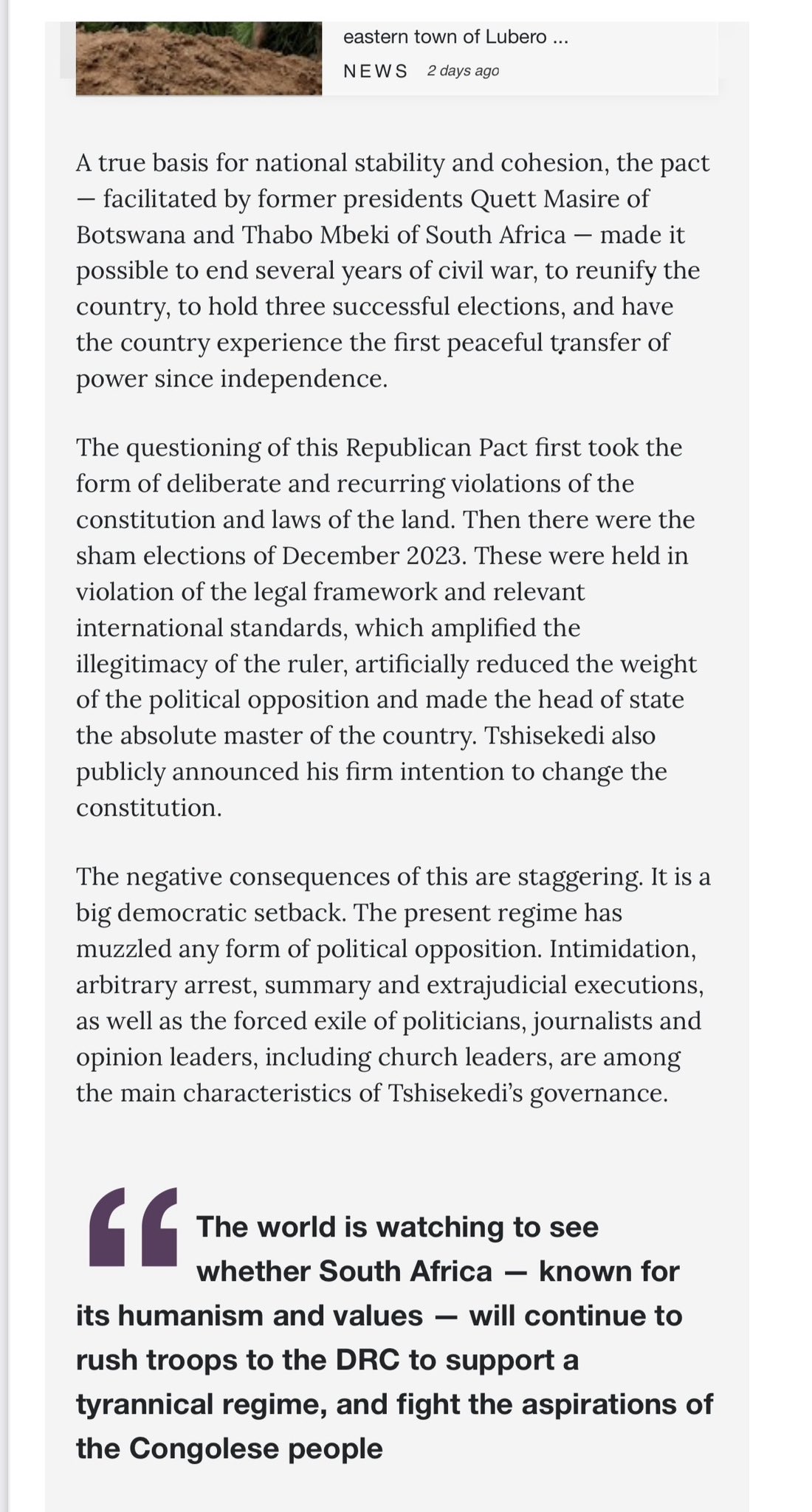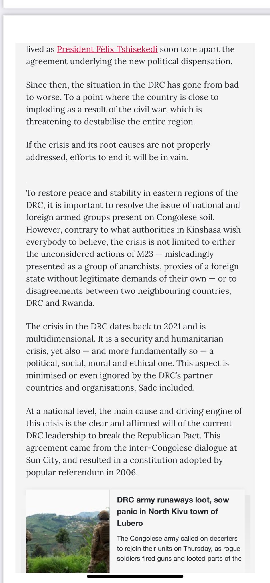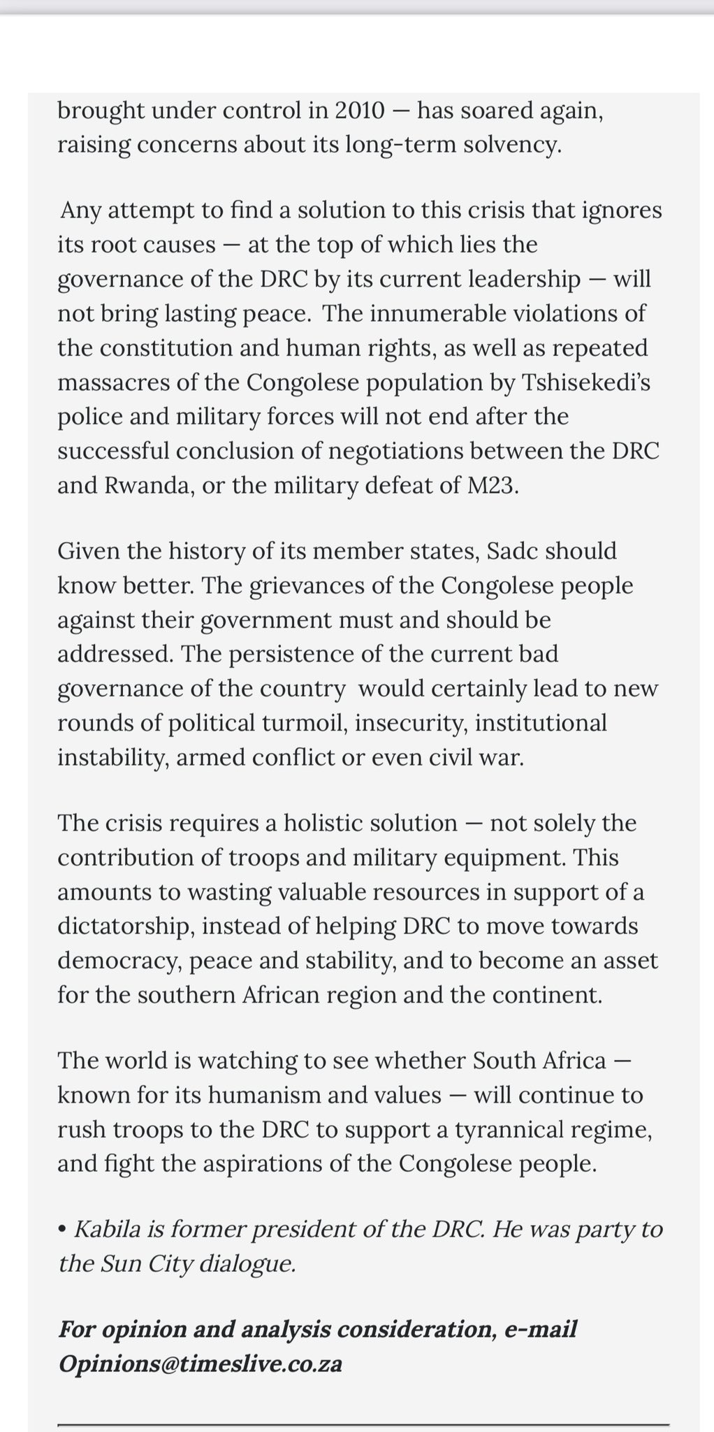 Sous les flashs éblouissants de la presse internationale et les murmures d’un peuple à bout, Kabila, avec sa barbe grisonnante et son regard chargé d’histoire, trace un tableau sombre mais ambitieux. « La crise en RDC est multidimensionnelle », déclare-t-il dans l’entretien, publié en une du journal sud-africain. Il ne s’agit pas seulement d’un conflit armé avec le M23 ou d’une querelle frontalière avec le Rwanda, martèle-t-il, mais d’une « crise politique, sociale, morale et éthique » remontant à 2021. Pour Kabila, les autorités de Kinshasa, sous la direction de Tshisekedi, tentent de masquer la vérité en réduisant le chaos à une simple question de sécurité régionale, ignorant les revendications légitimes des Congolais.