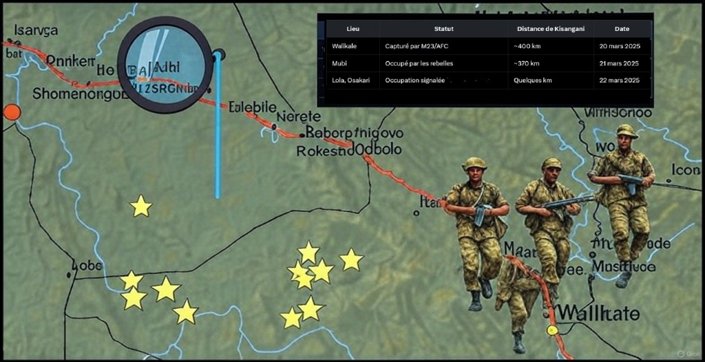 Les dernières nouvelles du terrain sont troublantes. Le 20 mars 2025, les insurgés ont pris Walikale, un bastion minier du Nord-Kivu situé à environ 400 kilomètres de Kisangani. Ce n’était qu’un prélude. Dès le lendemain, ils ont poussé leur avantage jusqu’à Mubi, un village à 30 kilomètres à l’ouest de Walikale, consolidant leur emprise sur cette zone stratégique. Et maintenant, des rapports font état de la capture de Lola et Osakari et Yangambi Fataki, des localités à quelques encablures seulement de Kisangani. Si ces informations se vérifient, les rebelles seraient aux portes de la ville, prêts à frapper un grand coup.