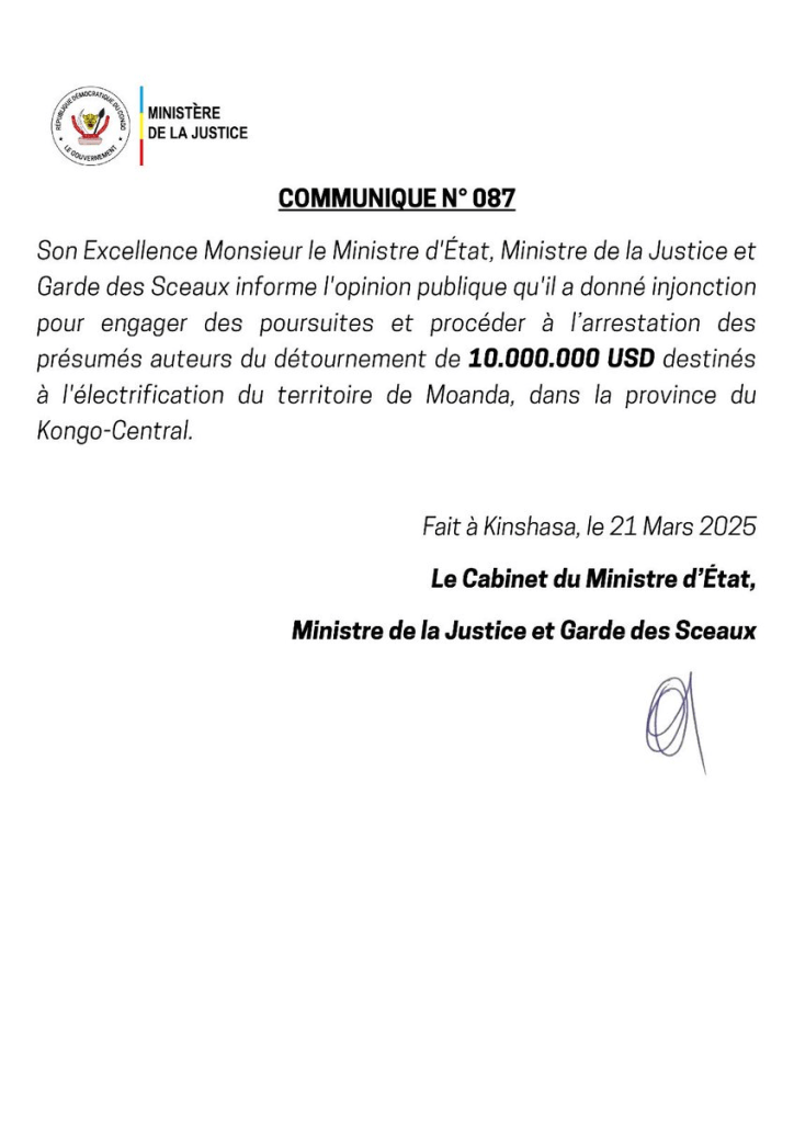 Kinshasa, 26 mars 2025 – Un nouveau scandale de corruption secoue la République démocratique du Congo (RDC). Dans un communiqué percutant publié le 21/03/25, le Ministère de la Justice et Garde des Sceaux annonce des poursuites judiciaires contre les responsables du détournement de 10 millions USD destinés au développement de Muanda (ou Moanda), une ville côtière de la province du Kongo-Central.